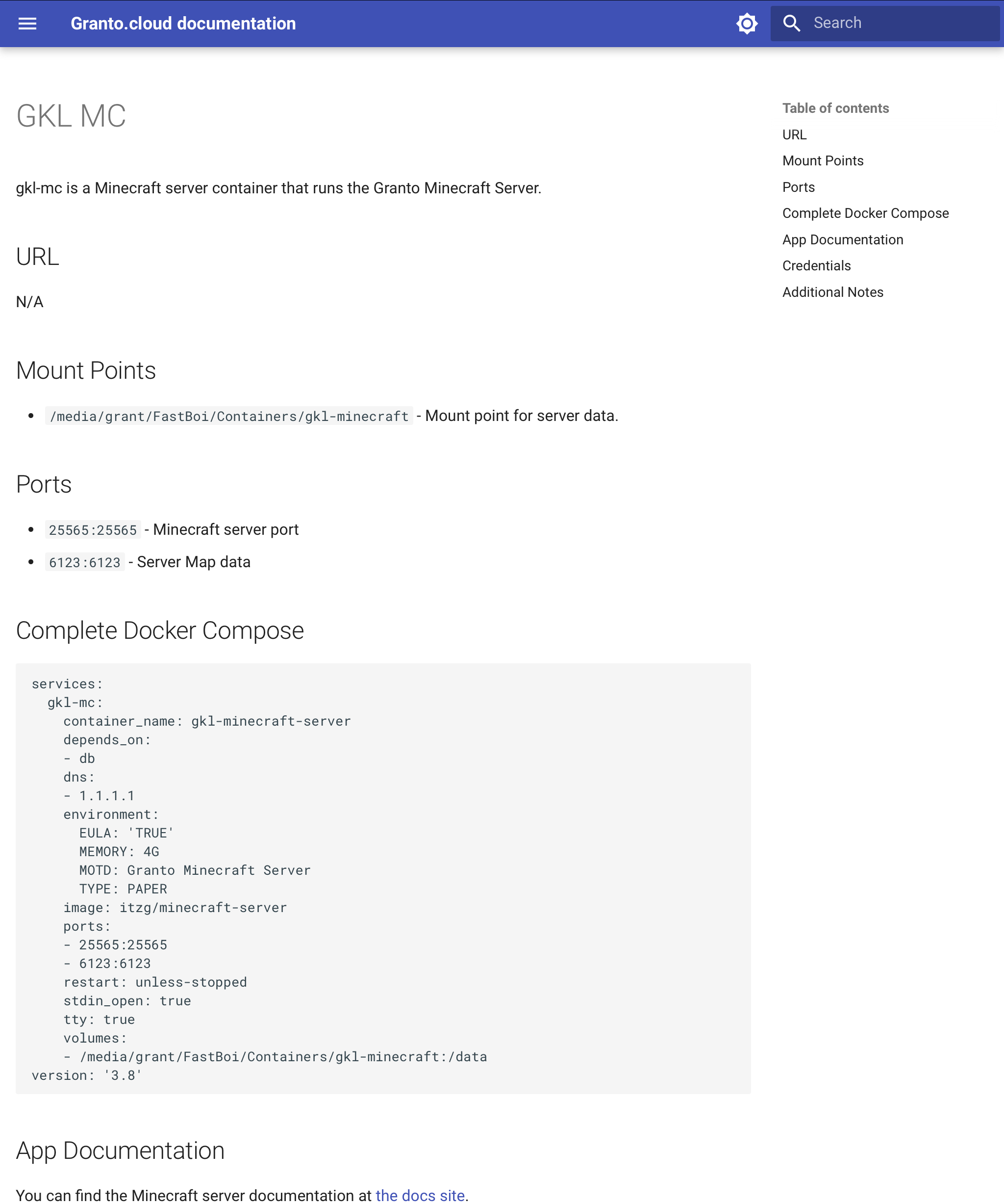 This documentation above was almost entirely generated by AI. I had to add the context that 6123 is the port for the server map powered by dynmap, but GPT 3.5 knew that 25565 was the standard Minecraft server port. It linked the correct documentation to the dockerized Minecraft server container I use. Fun note - the official docs for this container also use Material for Mkdocs and look great!