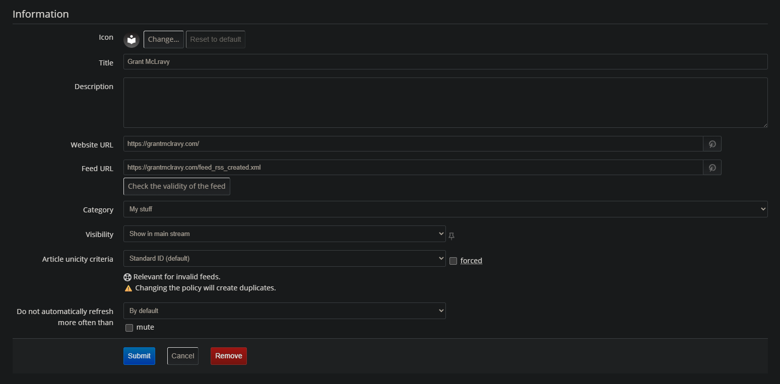 After fixing these things, my feed validated. I was able to add it to FreshRSS: