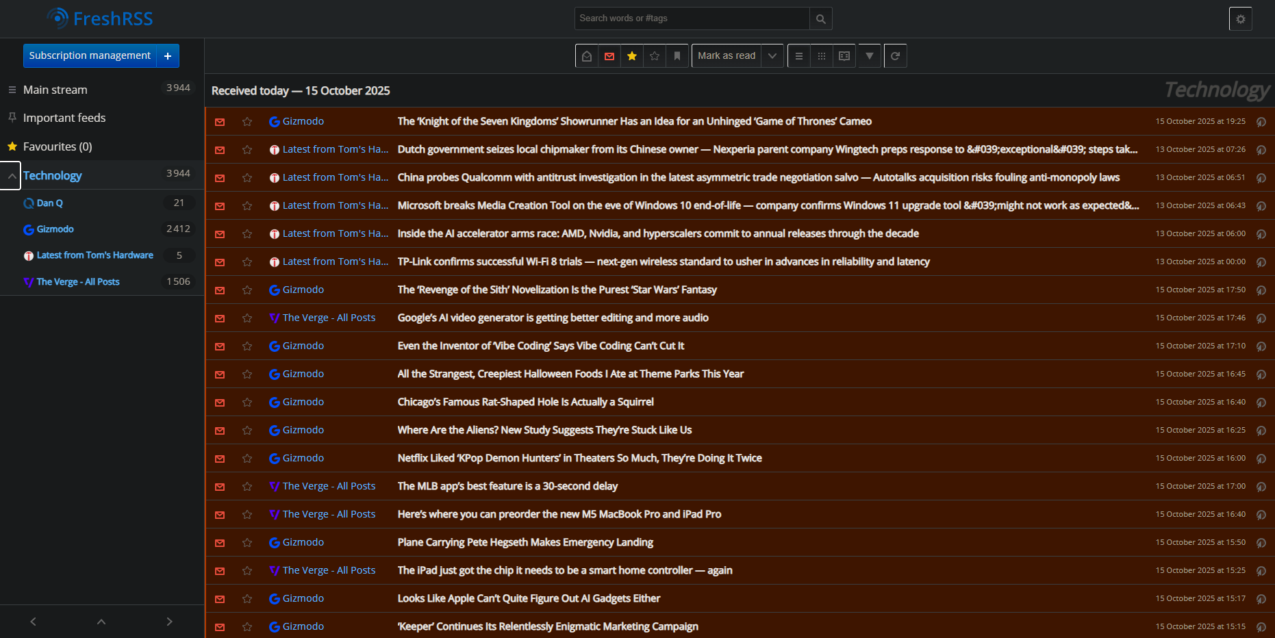 I am not yet an RSS power user but I have started an attempt to roll out a feed reader for myself. Back in the day, I myself used to be a big Google Reader fan. In current day, I've started to use FreshRSS as my self-hosted feed reader of choice. It's a simple to use feed reader that doesn't look too bad, either!