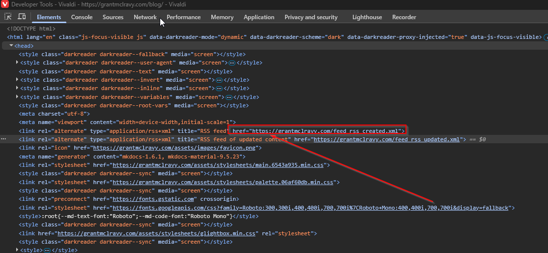 Once I successfully set up the plugin, it automatically set up an RSS feed for my site at https://grantmclravy.com/feed_rss_created.xml and set up the necessary headers in the <head> element of my blog.