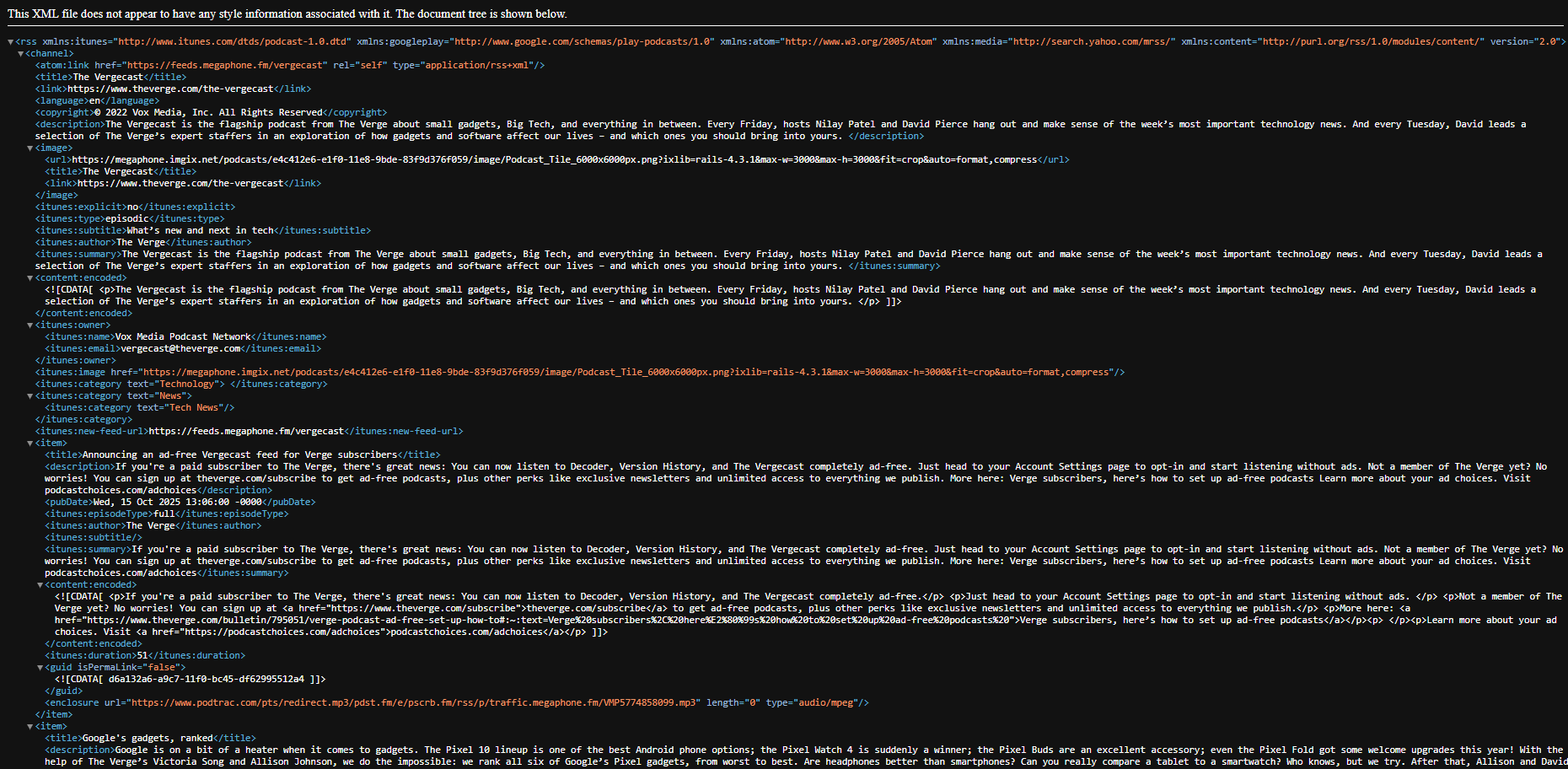 Fun fact - the standard way to distribute a podcast is actually based on RSS. If I go to the RSS feed for the Vergecast in my browser, I can see the raw XML of what a podcast app actually receives.